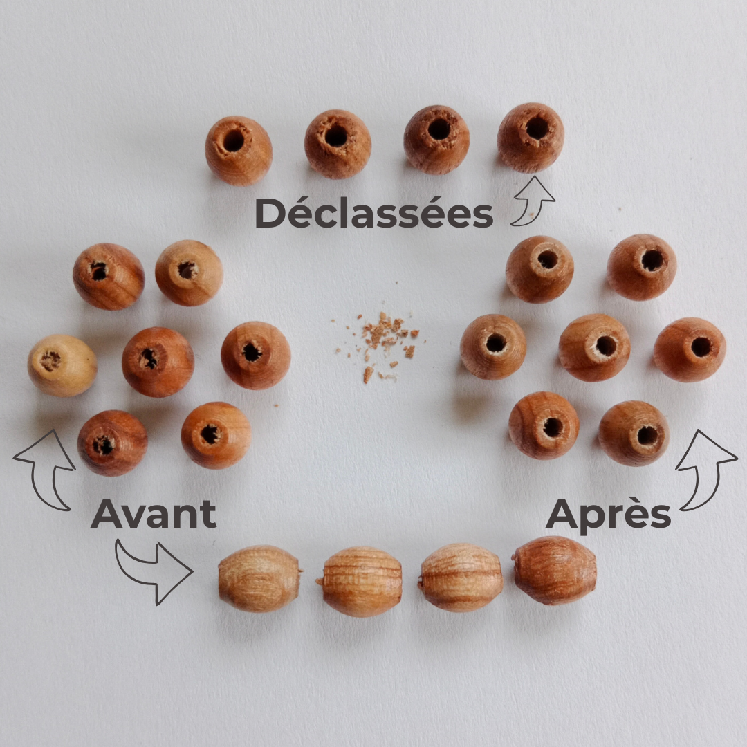 - d'autres perles locales en bois de hêtre, charme, olivier, frêne ou chêne